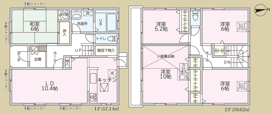 | 床面積 | 1階57.14u 2階59.62u 合計116.76u | |||
